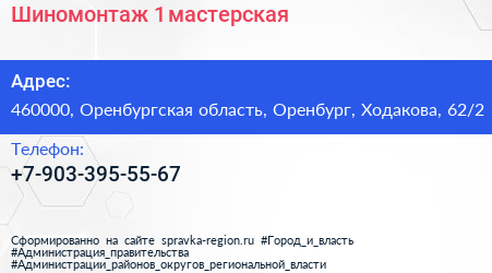 Шиномонтаж №1, мастерская по адресу 460000, Оренбургская область, Оренбург, Ходакова, 62/2 в дальнейшем Организация, размещена в следующих категориях: