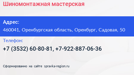 Шиномонтажная мастерская по адресу 460041, Оренбургская область, Оренбург, Садовая, 50 в дальнейшем Организация, размещена в следующих категориях: