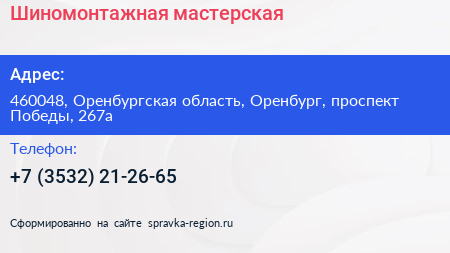 Шиномонтажная мастерская по адресу 460048, Оренбургская область, Оренбург, проспект Победы, 267а в дальнейшем Организация, размещена в следующих категориях: