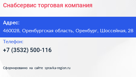 Снабсервис, торговая компания по адресу 460028, Оренбургская область, Оренбург, Шоссейная, 28 в дальнейшем Организация, размещена в следующих категориях: