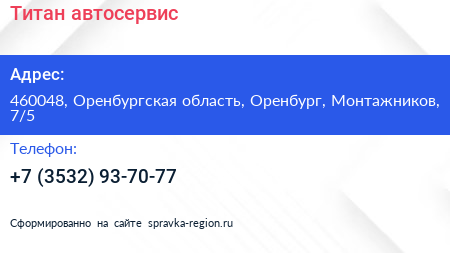 Титан, автосервис по адресу 460048, Оренбургская область, Оренбург, Монтажников, 7/5 в дальнейшем Организация, размещена в следующих категориях: