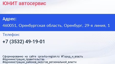 ЮНИТ, автосервис по адресу 460051, Оренбургская область, Оренбург, 29-я линия, 1 в дальнейшем Организация, размещена в следующих категориях: