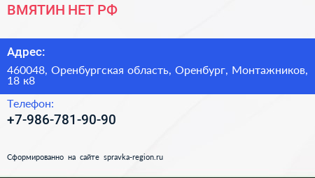 ВМЯТИН-НЕТ.РФ по адресу 460048, Оренбургская область, Оренбург, Монтажников, 18 к8 в дальнейшем Организация, размещена в следующих категориях: