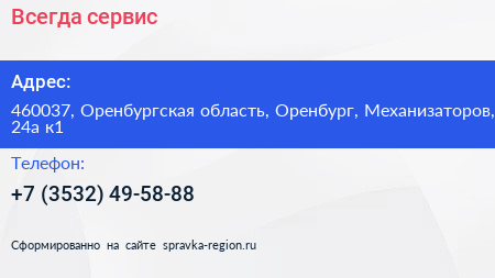 Всегда сервис по адресу 460037, Оренбургская область, Оренбург, Механизаторов, 24а к1 в дальнейшем Организация, размещена в следующих категориях: