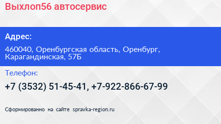 Выхлоп56, автосервис по адресу 460040, Оренбургская область, Оренбург, Карагандинская, 57Б в дальнейшем Организация, размещена в следующих категориях: