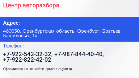 Центр авторазбора по адресу 460050, Оренбургская область, Оренбург, Братьев Башиловых, 1а в дальнейшем Организация, размещена в следующих категориях: