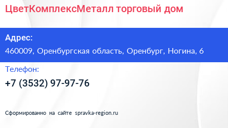 ЦветКомплексМеталл, торговый дом по адресу 460009, Оренбургская область, Оренбург, Ногина, 6 в дальнейшем Организация, размещена в следующих категориях: