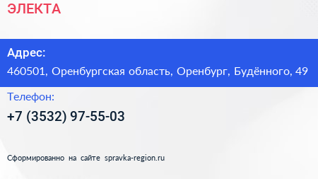 ЭЛЕКТА по адресу 460501, Оренбургская область, Оренбург, Будённого, 49 в дальнейшем Организация, размещена в следующих категориях: