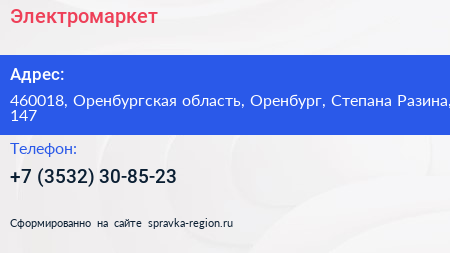 Электромаркет по адресу 460018, Оренбургская область, Оренбург, Степана Разина, 147 в дальнейшем Организация, размещена в следующих категориях: