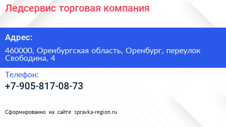 Ледсервис, торговая компания по адресу 460000, Оренбургская область, Оренбург, переулок Свободина, 4 в дальнейшем Организация, размещена в следующих категориях: