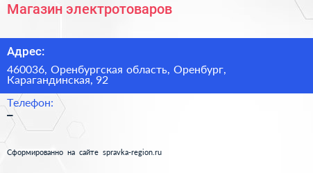 Магазин электротоваров по адресу 460036, Оренбургская область, Оренбург, Карагандинская, 92 в дальнейшем Организация, размещена в следующих категориях: