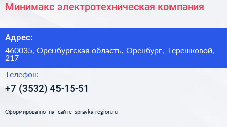 Минимакс, электротехническая компания по адресу 460035, Оренбургская область, Оренбург, Терешковой, 217 в дальнейшем Организация, размещена в следующих категориях: