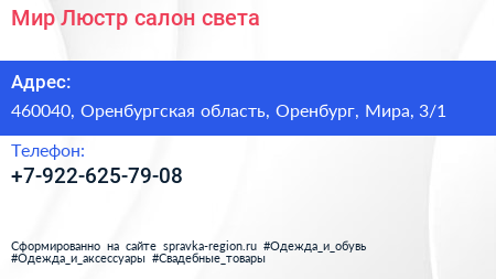 Мир Люстр, салон света по адресу 460040, Оренбургская область, Оренбург, Мира, 3/1 в дальнейшем Организация, размещена в следующих категориях: