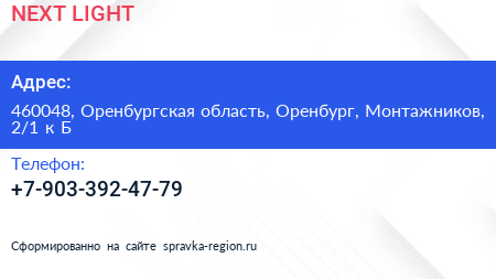 NEXT LIGHT по адресу 460048, Оренбургская область, Оренбург, Монтажников, 2/1 к Б в дальнейшем Организация, размещена в следующих категориях: