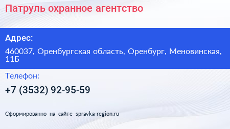 Патруль, охранное агентство по адресу 460037, Оренбургская область, Оренбург, Меновинская, 11Б в дальнейшем Организация, размещена в следующих категориях: