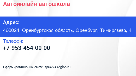 Автоинлайн, автошкола по адресу 460024, Оренбургская область, Оренбург, Тимирязева, 4 в дальнейшем Организация, размещена в следующих категориях: