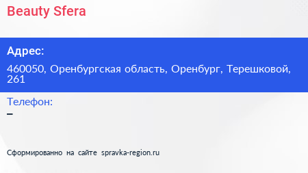 Beauty Sfera по адресу 460050, Оренбургская область, Оренбург, Терешковой, 261 в дальнейшем Организация, размещена в следующих категориях: