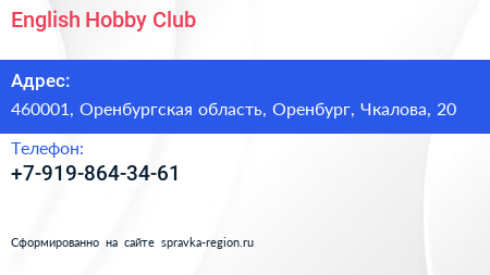 English Hobby Club по адресу 460001, Оренбургская область, Оренбург, Чкалова, 20 в дальнейшем Организация, размещена в следующих категориях: