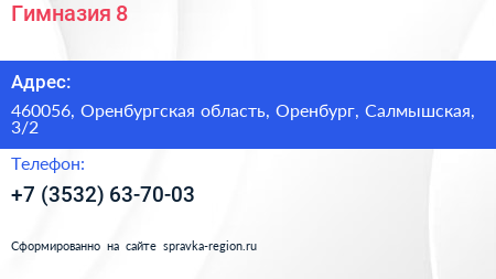 Гимназия №8 по адресу 460056, Оренбургская область, Оренбург, Салмышская, 3/2 в дальнейшем Организация, размещена в следующих категориях: