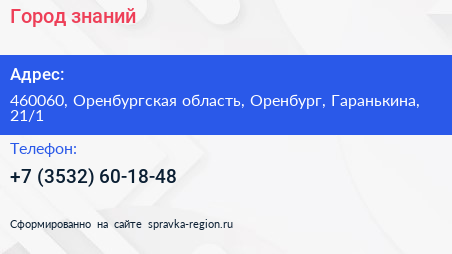 Город знаний по адресу 460060, Оренбургская область, Оренбург, Гаранькина, 21/1 в дальнейшем Организация, размещена в следующих категориях: