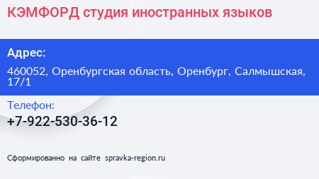 КЭМФОРД, студия иностранных языков по адресу 460052, Оренбургская область, Оренбург, Салмышская, 17/1 в дальнейшем Организация, размещена в следующих категориях: