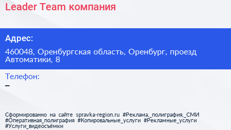 Leader Team, компания по адресу 460048, Оренбургская область, Оренбург, проезд Автоматики, 8 в дальнейшем Организация, размещена в следующих категориях:
