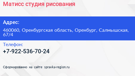 Матисс, студия рисования по адресу 460060, Оренбургская область, Оренбург, Салмышская, 67/4 в дальнейшем Организация, размещена в следующих категориях: