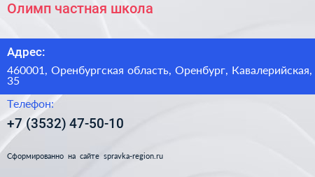 Олимп, частная школа по адресу 460001, Оренбургская область, Оренбург, Кавалерийская, 35 в дальнейшем Организация, размещена в следующих категориях: