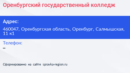 Оренбургский государственный колледж по адресу 460047, Оренбургская область, Оренбург, Салмышская, 11 к1 в дальнейшем Организация, размещена в следующих категориях: