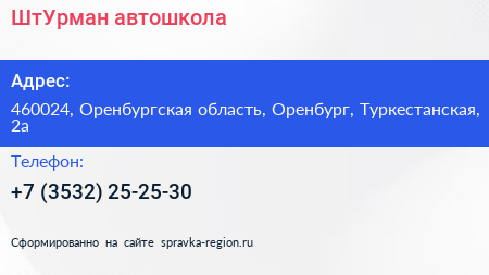ШтУрман, автошкола по адресу 460024, Оренбургская область, Оренбург, Туркестанская, 2а в дальнейшем Организация, размещена в следующих категориях: