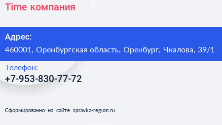 Time, компания по адресу 460001, Оренбургская область, Оренбург, Чкалова, 39/1 в дальнейшем Организация, размещена в следующих категориях: