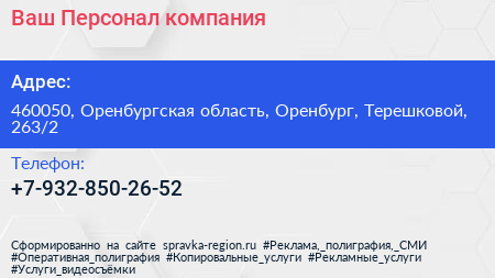 Ваш Персонал, компания по адресу 460050, Оренбургская область, Оренбург, Терешковой, 263/2 в дальнейшем Организация, размещена в следующих категориях:
