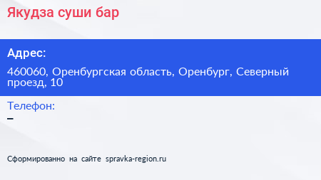 Якудза, суши-бар по адресу 460060, Оренбургская область, Оренбург, Северный проезд, 10 в дальнейшем Организация, размещена в следующих категориях: