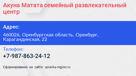 Акуна Матата, семейный развлекательный центр по адресу 460026, Оренбургская область, Оренбург, Карагандинская, 22 в дальнейшем Организация, размещена в следующих категориях: