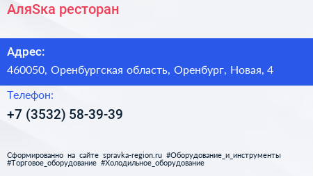 АляSка, ресторан по адресу 460050, Оренбургская область, Оренбург, Новая, 4 в дальнейшем Организация, размещена в следующих категориях: