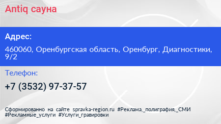 Antiq, сауна по адресу 460060, Оренбургская область, Оренбург, Диагностики, 9/2 в дальнейшем Организация, размещена в следующих категориях: