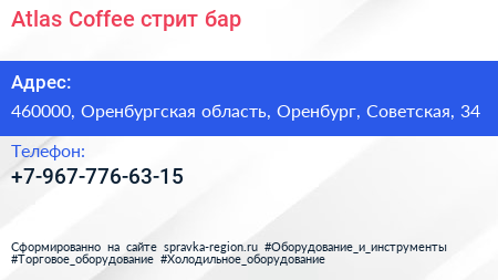 Atlas Coffee, стрит-бар по адресу 460000, Оренбургская область, Оренбург, Советская, 34 в дальнейшем Организация, размещена в следующих категориях: