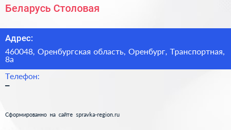 Беларусь, Столовая по адресу 460048, Оренбургская область, Оренбург, Транспортная, 8а в дальнейшем Организация, размещена в следующих категориях: