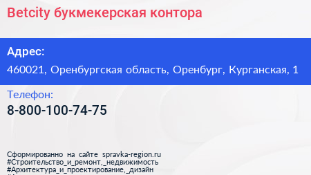 Betcity, букмекерская контора по адресу 460021, Оренбургская область, Оренбург, Курганская, 1 в дальнейшем Организация, размещена в следующих категориях: