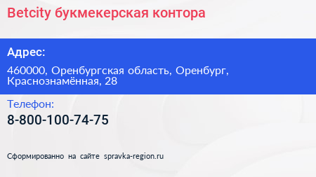 Betcity, букмекерская контора по адресу 460000, Оренбургская область, Оренбург, Краснознамённая, 28 в дальнейшем Организация, размещена в следующих категориях: