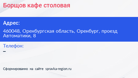 Борщов, кафе-столовая по адресу 460048, Оренбургская область, Оренбург, проезд Автоматики, 8 в дальнейшем Организация, размещена в следующих категориях: