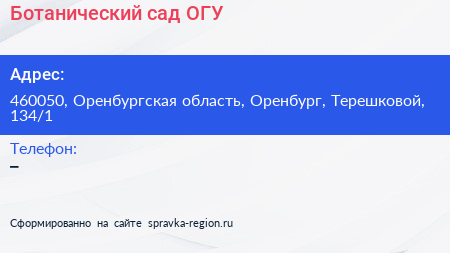 Ботанический сад, ОГУ по адресу 460050, Оренбургская область, Оренбург, Терешковой, 134/1 в дальнейшем Организация, размещена в следующих категориях: