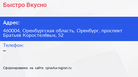 Быстро Вкусно по адресу 460004, Оренбургская область, Оренбург, проспект Братьев Коростелёвых, 52 в дальнейшем Организация, размещена в следующих категориях: