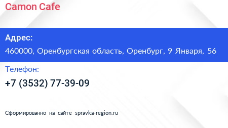 Camon Cafe по адресу 460000, Оренбургская область, Оренбург, 9 Января, 56 в дальнейшем Организация, размещена в следующих категориях: