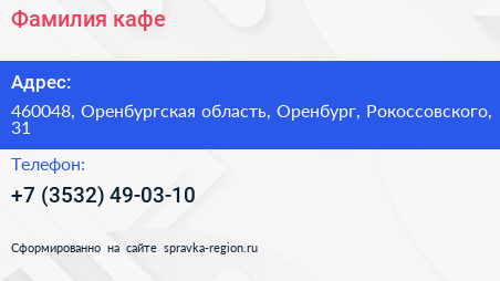 Фамилия, кафе по адресу 460048, Оренбургская область, Оренбург, Рокоссовского, 31 в дальнейшем Организация, размещена в следующих категориях:
