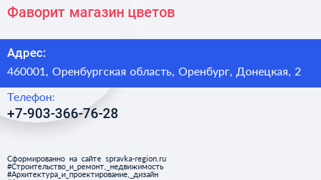 Фаворит, магазин цветов по адресу 460001, Оренбургская область, Оренбург, Донецкая, 2 в дальнейшем Организация, размещена в следующих категориях: