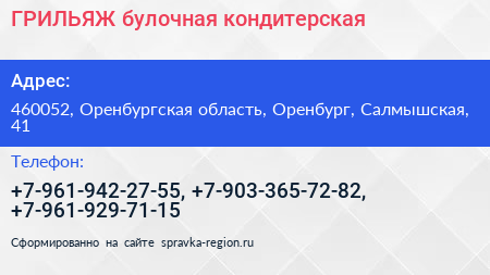ГРИЛЬЯЖ, булочная-кондитерская по адресу 460052, Оренбургская область, Оренбург, Салмышская, 41 в дальнейшем Организация, размещена в следующих категориях:
