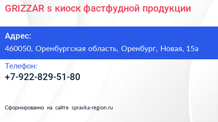 GRIZZAR`s, киоск фастфудной продукции по адресу 460050, Оренбургская область, Оренбург, Новая, 15а в дальнейшем Организация, размещена в следующих категориях: