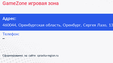 GameZone, игровая зона по адресу 460044, Оренбургская область, Оренбург, Сергея Лазо, 13 в дальнейшем Организация, размещена в следующих категориях: