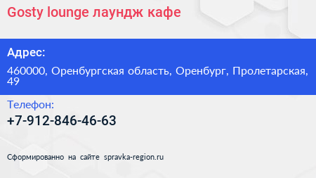 Gosty-lounge, лаундж-кафе по адресу 460000, Оренбургская область, Оренбург, Пролетарская, 49 в дальнейшем Организация, размещена в следующих категориях: